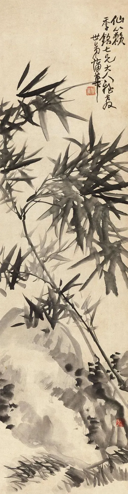 其画竹法门暗合禅宗"当头棒喝"的机锋。传统画竹讲究"起手式",蒲华却偏要打破章法:竹叶堆叠如暴雨倾盆,枝干交错似乱藤缠树,甚至让墨迹溢出画外,侵占观者的想象空间。这种"失控"的笔法,恰是画家对"画竹须有竹影在胸"的嘲弄——当世人执着于形似时,他早已将竹子化为自己酒葫芦里倒出的醉意。